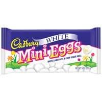 CADBURY MINI EGGS White Candy, 7 oz | Cadbury CADBURY MINI EGGS White Candy, 7 oz. The same smooth filling and crispy candy egg shell you love, with a silky white creme center. Grab a bag for any white Candy lover. Buy Now. Nutrition Information. 150 Calories. 4 Sat Fat (g) 21 Sugars (g) 35 Sodium (mg)