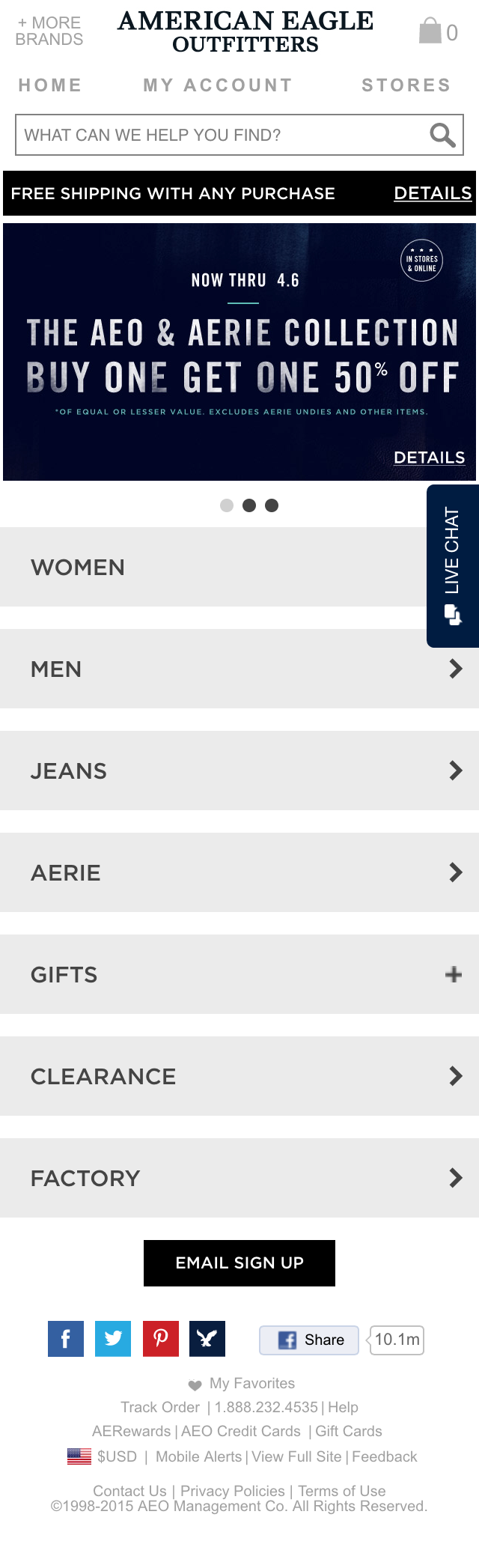 Sign Up For Emails | American Eagle 1-888-232-4535 EMAIL US! LIVE CHAT Get hooked up with AEO & Aerie! Sign Up for emails to receive exclusive offers, style tips and more. You can unsubscribe at any time by clicking the "UNSUBSCRIBE" link at the bottom of any promotional email. American Eagle Outfitters: 77 Hot Metal St., Pittsburgh PA 15203, USA. CustomerCare@ae.com Help Topics